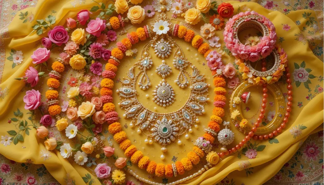 If you’re looking for floral jewelry ideas that are full of color and tradition, marigold flowers are the perfect pick. These bright orange and yellow blooms are known for their vibrant look and festive charm. Brides love using marigolds in their necklaces, headpieces, and headdresses to add a bold touch to their Mayun look.