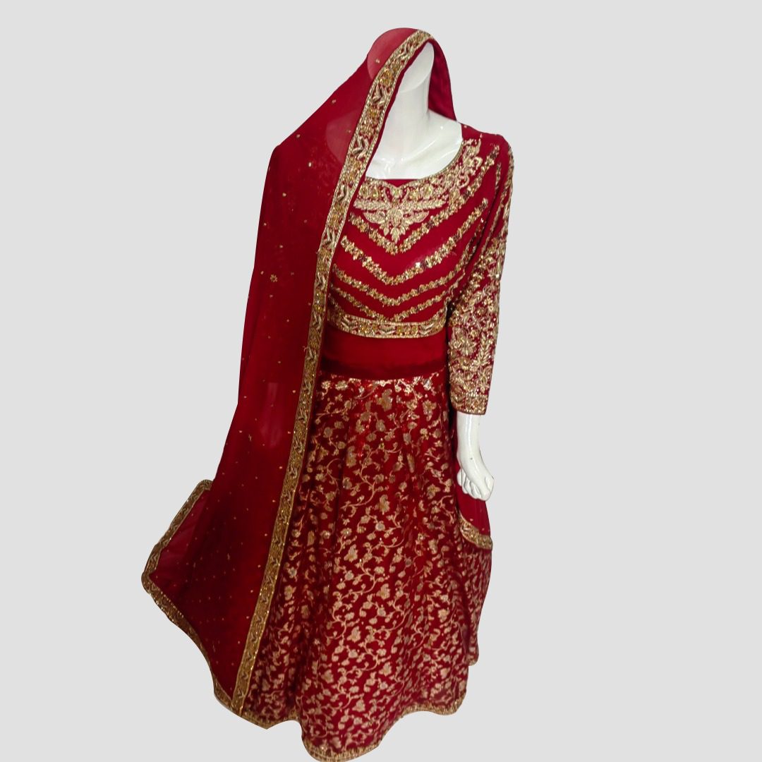 The Deep Red Royalty Sharara Dress is a masterpiece designed to make brides feel regal and confident on their special day. Crafted from soft, luxurious chiffon, this dress offers both comfort and elegance. The rich, deep red color exudes a royal aura, making it the perfect choice for Barat ceremonies and grand weddings. This color symbolizes love, passion, and celebration, ensuring you stand out while maintaining grace and poise.