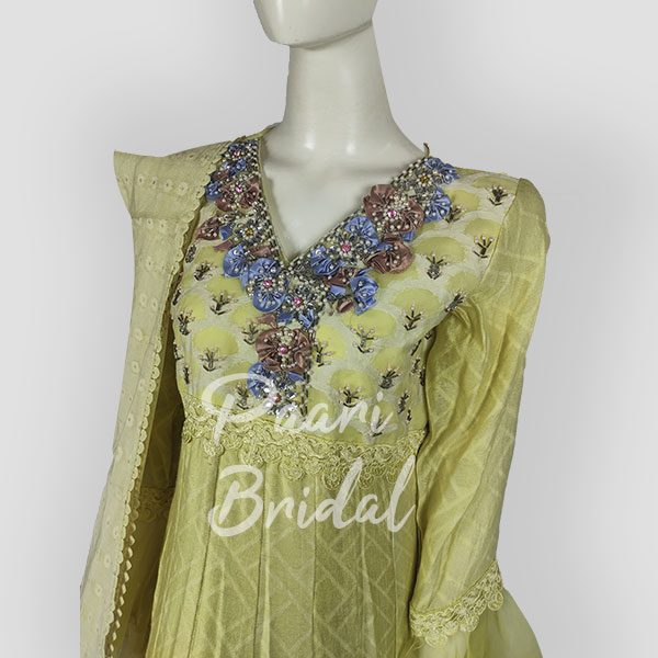 This exquisite frock features handmade embroidery adorned with intricate 3D multi-flower patterns. Shimmering beads, crystals, and pulse work enhance the vibrant designs, creating a dazzling effect that beautifully catches the light. Every detail is carefully handcrafted to exude elegance and sophistication.
