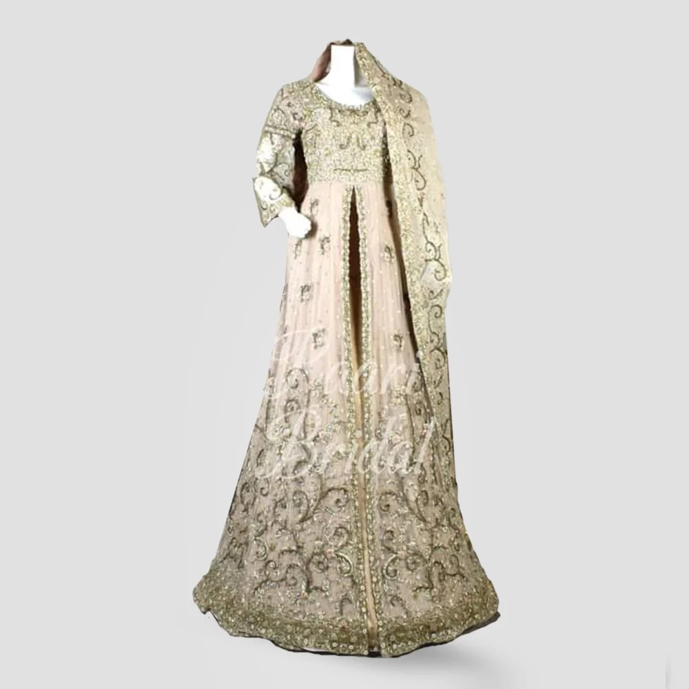 The Peachy Charm Walima Maxi is the epitome of grace and sophistication, designed to make every bride feel like a vision of elegance on her special day. This handcrafted masterpiece seamlessly blends timeless tradition with modern bridal fashion, making it an ideal choice for a Walima celebration.