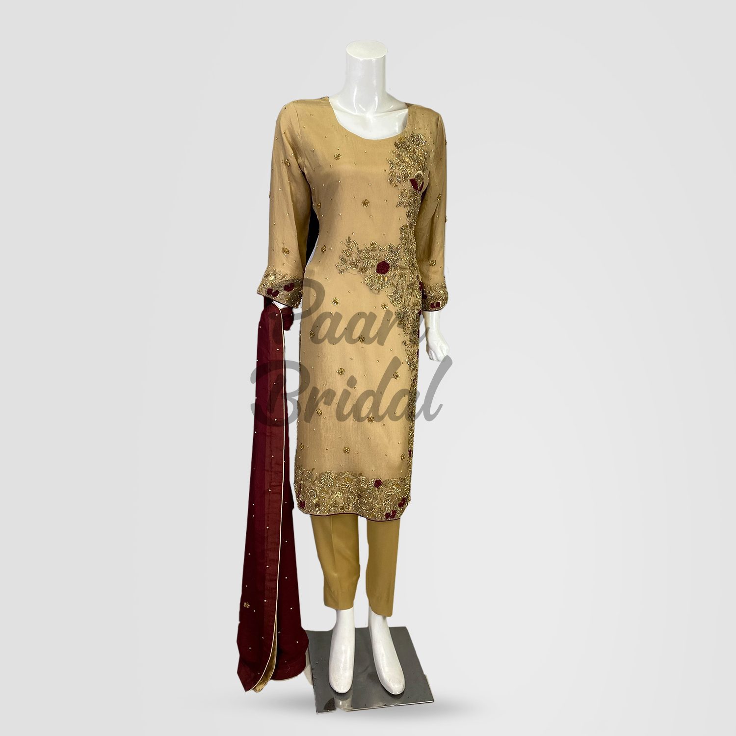 The intricate embroidery work on the dress sets it apart. With load dapka, resham, gijai, and maruri detailing, the dress features stunning handwork that adds depth and texture. The designer meticulously places each stitch, creating a sophisticated and luxurious finish that shines from every angle. The rich mahogany maroon color beautifully complements the intricate embellishments, making this dress a true masterpiece.
